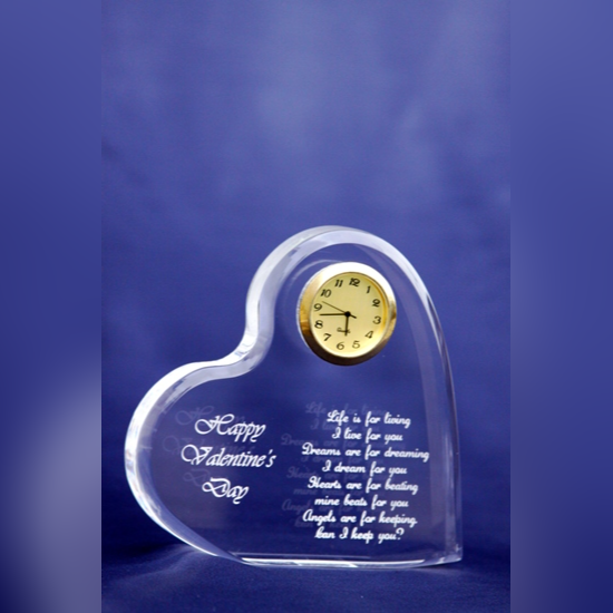 Categories: Acrylic Gifts & Tokens, Gifts & Tokens Tags: acrylic, clear, clock, desk, engravable, gift, heart, token