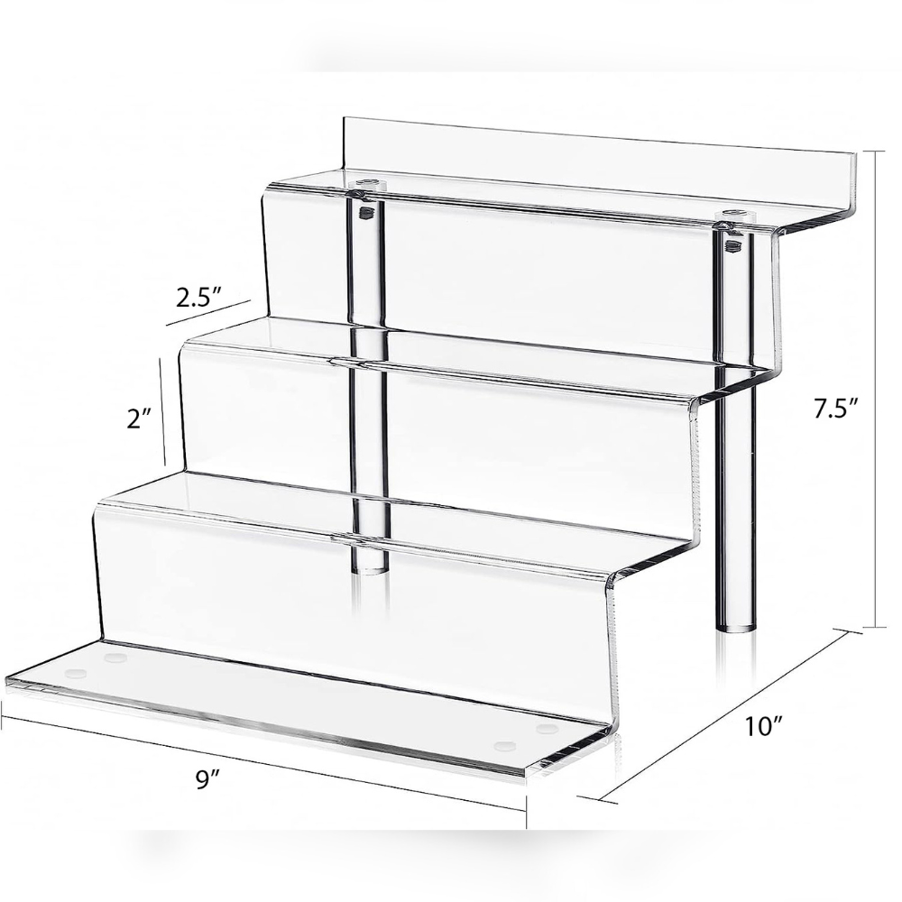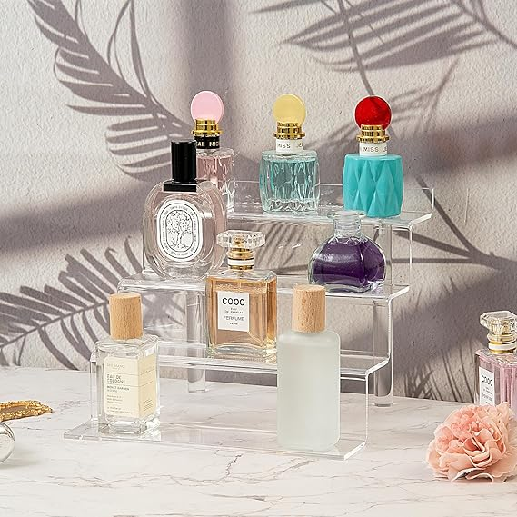 Clear acrylic step display with a sturdy, non-slip design for secure placement. Perfect for neatly showcasing perfumes, collectibles, desserts, and retail products with a clean, professional look.