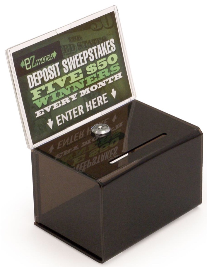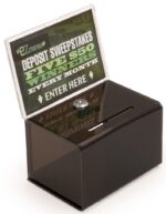 This versatile black acrylic suggestion box is ideal for contests, elections, fundraisers, and more. Featuring a secure locking mechanism, it ensures the safety of ballots, donations, or feedback. The 3-1/2” drop slot is spacious enough to accommodate both coins and bills, making it perfect for fundraising. Additionally, the 6” x 4” sign frame allows for easy customization of messages or instructions. Its sleek and professional design makes it a great choice for any event or public space.