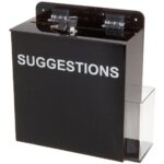 This black acrylic suggestion box combines sleek design with functionality. It features a 9” wide drop slot for easy submission of suggestions or ballots, and a secure lock for added protection. The box also includes a clear acrylic side pocket, ideal for holding forms, brochures, or additional materials. Perfect for offices, events, or customer feedback collection, this sturdy and professional box offers both security and convenience.