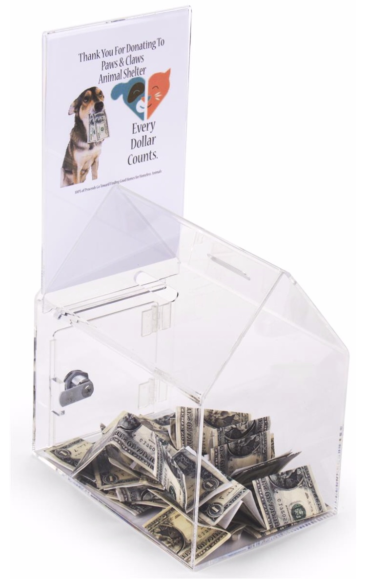 This unique house-shaped donation box is designed to attract attention and collect funds with ease. Each side of the roof features a coin slot for convenient donations. The box is equipped with a hinged locking door to ensure security and prevent tampering. A 5.5” W x 8.5” H sign holder allows for easy display of instructions or messages. Crafted from durable clear acrylic, this donation box combines functionality with a charming design, making it perfect for fundraising events, charity drives, or community initiatives.