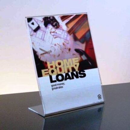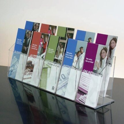 This two-tiered acrylic leaflet holder features dual pockets, perfect for displaying 4″ wide brochures and leaflets.