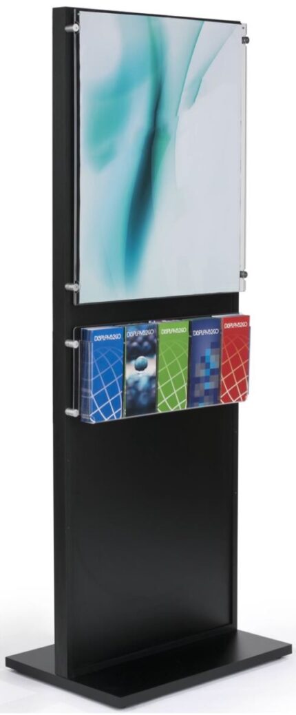 This wooden poster stand has a black finish, an acrylic panel with standoffs, and a 5-pocket brochure holder, providing a stylish, organized display for posters and brochures in professional settings. 18"W x 66.5"H x 17.5D Pockets: 21.6" x 9.1" x 1.5" each