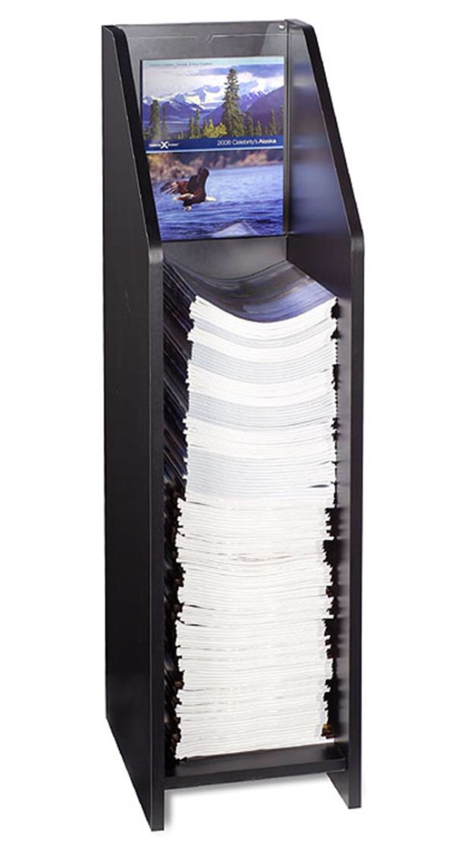 This display stand features a clear acrylic header, perfect for showcasing front-page advertisements or highlighting key messages. Constructed from durable melamine wood with a sleek black finish, it seamlessly complements a wide range of environments, from office lobbies to retail spaces. The open design not only enhances accessibility, allowing quick and easy access to a large stack of documents, but also keeps materials organized and visible. Its sturdy build and modern look make it an ideal solution for efficiently displaying brochures, magazines, or promotional materials in high-traffic areas.